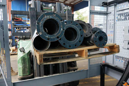 A pallet load of carbon steel, Schedule 40 pipe is raised on a forklift and ready for wrapping.