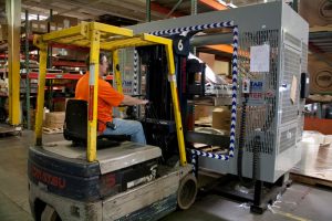 From a review of data on returned orders, Schoenborn noted that most of these returns were due to scratches, scuffs and other defects that occurred during transport to the customer. The high center of gravity of the finished furniture and equipment, the mass of many heavy, metal parts and/or their sometimes long or unwieldy shapes are prone to shifting inside trucks and trailers. The plastic film was not always strong or wrapped well enough to keep the parts and products secured in place. All too often, a large bump, short stop at a traffic light or tight turn would cause large pieces of metal to slide off of the pallet and arrive scarred from the trip and unacceptable upon inspection. Orders were either wrapped on a semi-automatic, horizontal stretch wrapper or by hand. Though workers paid close attention to the plastic wrapping, the wrapping system was coming up short.